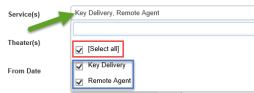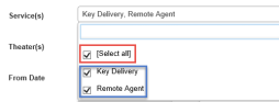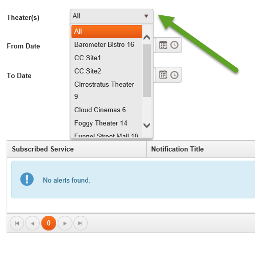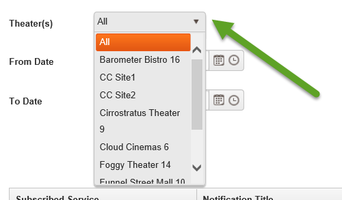 2 - Next click the Theaters you want to search history. You can either select a single theater or all of the theaters in the group you are searching. Click the Theater(s) box and a drop box will come down.