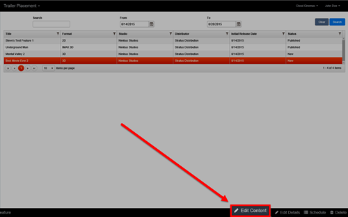 In this section, you can change the details of the content that has been added. This includes FORMAT, HOURS, MINUTES, SECONDS, SCHEDULING STUDIO, DISTRIBUTER, RATING, CPL UUID, and CPL DESCRIPTION.