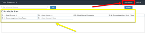3 - The top of you screen will show the Available Sites (yellow box) under the selected Exhibitor (red box).