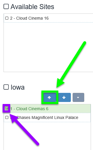 6.3 - Then you will see the Sites listed in the Tier. If you made an error, you can remove a site by clicking the small box next to the Site (purple box). Then click the "Up" arrow (green box).