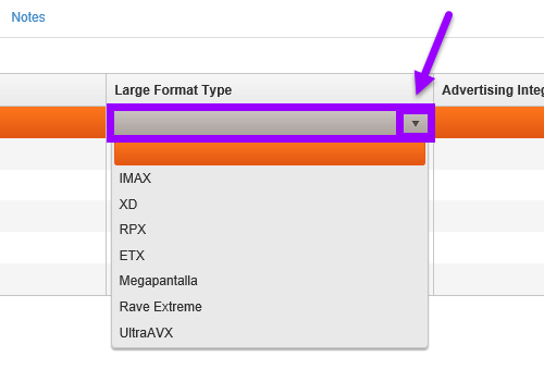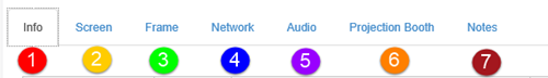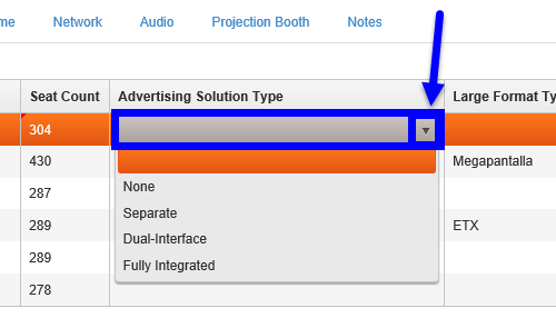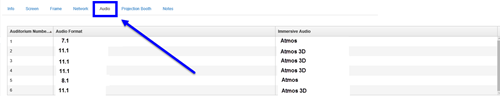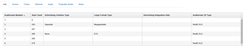 1 - INFORMATION - This tab tells you Auditorium Number, Seat Count, Advertising Solution Type, Large Format Type, Advertising Integration Data, Auditorium 3D Type.