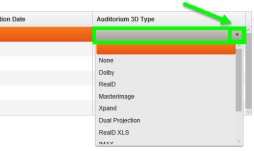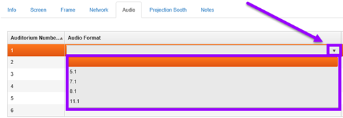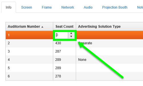1.1 - You can edit all but the "Auditorium Number" column on this tab. If you click on the SEAT COUNT number, in a particular Auditorium, you get a free form box where you can type in a new seat count (or you can use the up and down arrows).
