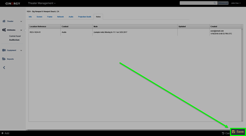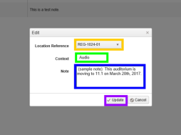 7.2 - This brings up a pop-up. The first section of this box is LOCATION REFERENCE (yellow box). This is essentially the auditorium the note is for. This is a drop box. The second box is for CONTEXT (green box). It is for putting in the subject of this note or what the note is in reference to. The third section is NOTE (blue box). This is where you can detail the information for the note. This has a 50 character limit.
