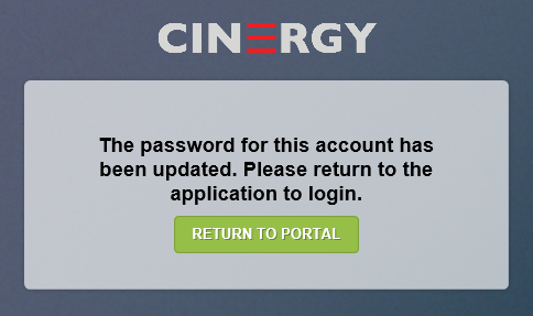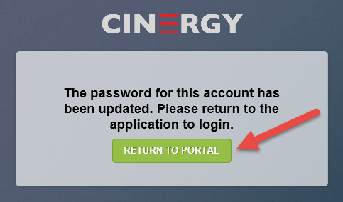 6 - If you are successful you will see: The password for this account has been updated. Please return to the application to login. Then click on the Return to Portal button.