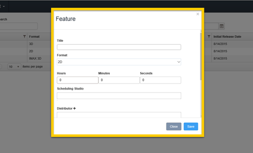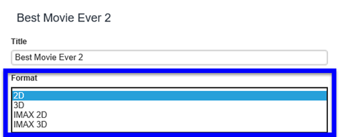4 - FORMAT - This is a drop box. Choose 2D, 3D, IMAX 2D, or IMAX 3D for the feature's format. These are the default options. If you added more formats in your settings, you will see those as options, as well.