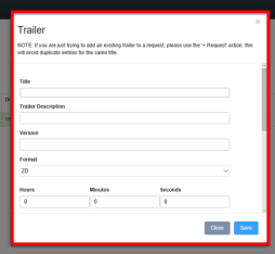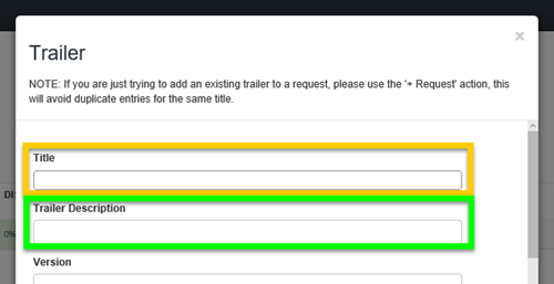 "NOTE: If you are just trying to add an existing trailer to a request, please use the '+ Request' action, this will avoid duplicate entries for the same title. "