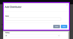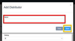 13.3 - Type the name of the Distributor in the NAME field (red box) and then click the blue SAVE button (yellow box). You can click the grey CLOSE button if you do not want to add a distributor.