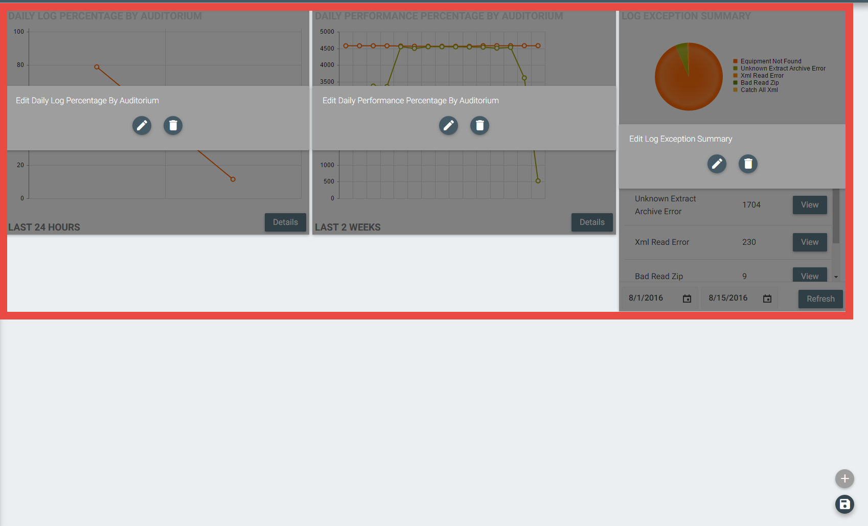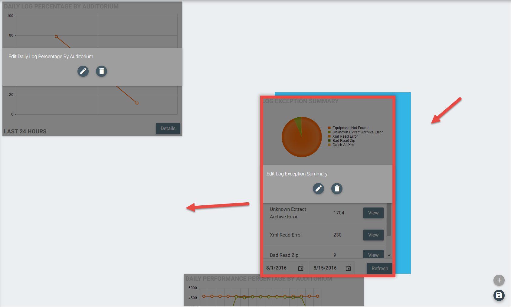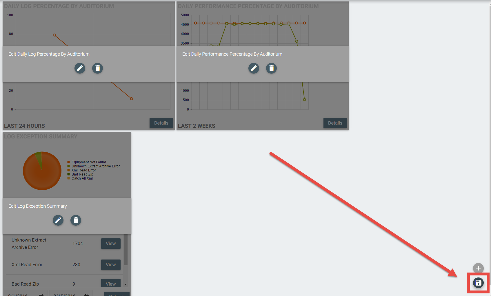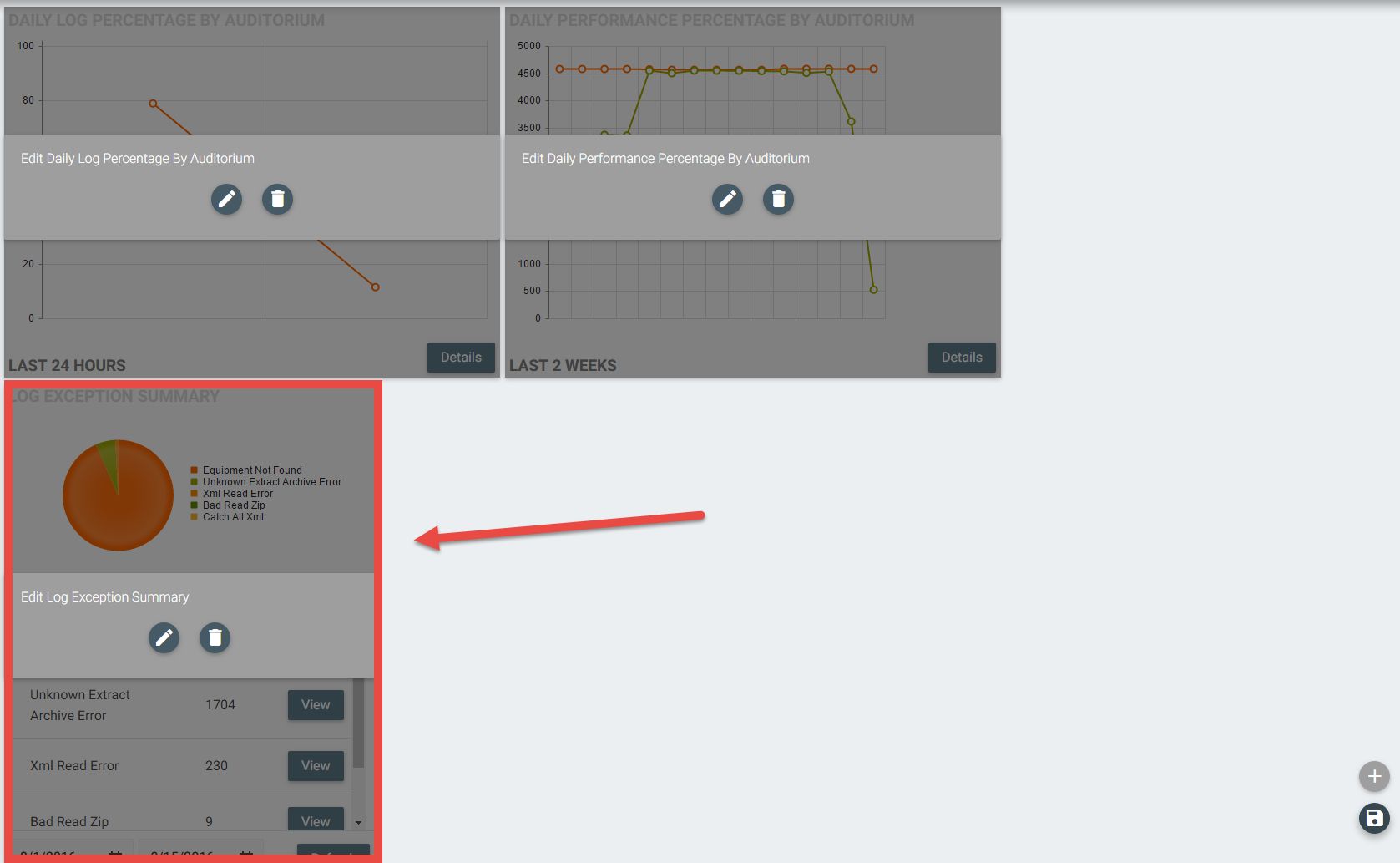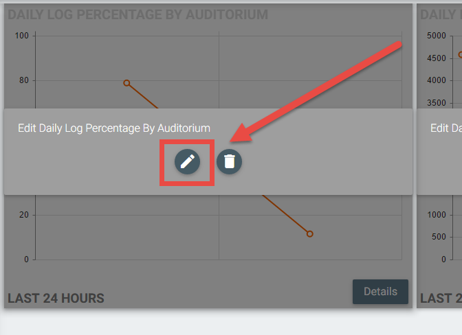 1 - From the Dashboard of Log Management, click on the "Pencil" icon in the lower right corner. You will see the widgets go "grey".