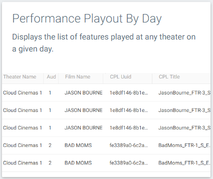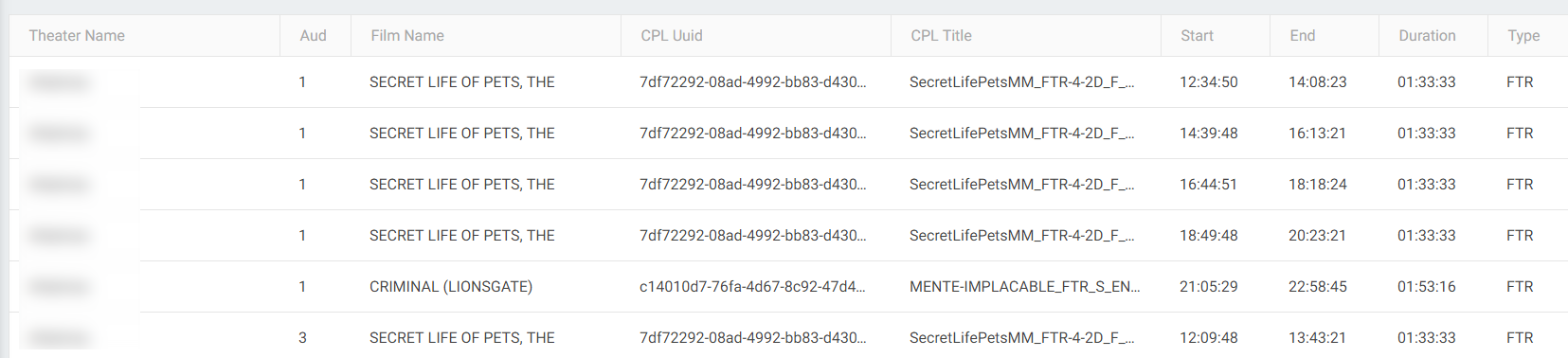 3 - The report will show theater name, auditorium number, film name, CPL Uuid, CPL Title, Start/End time, duration (length of film), and type (i.e. Feature, Short, etc).