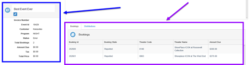 2.1 - If you click on one of the Invoices listed it will brings up an informational box (blue box). This box is not there until you select an Invoice. Also, you will see things listed under "Bookings" (purple box).