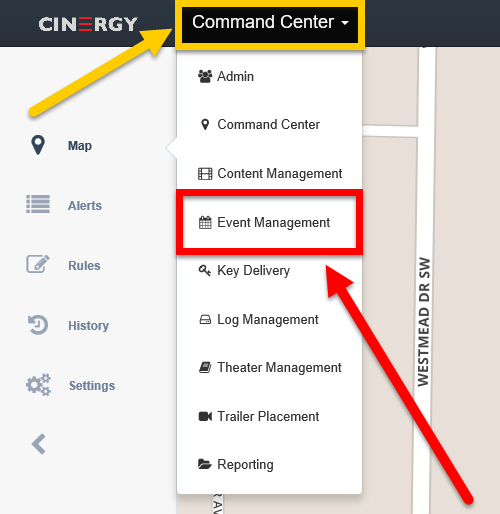 1 - From the Command Center, click on the drop box at the top of the screen (yellow box). Then choose EVENT MANAGEMENT from the list.