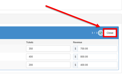 8 - Fill out the amount of Tickets sold and the Revenue generated by the tickets being sold. The example shown is $20 per ticket.