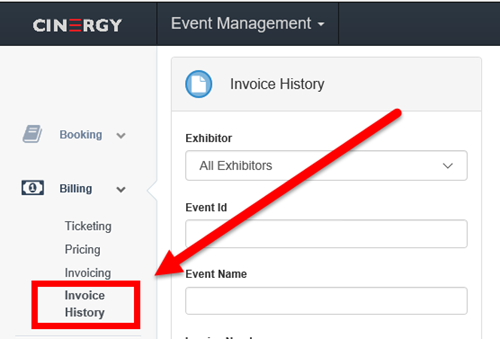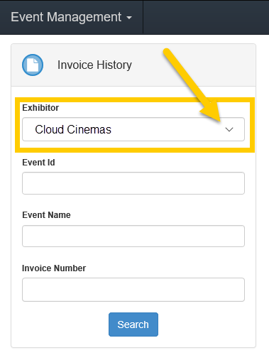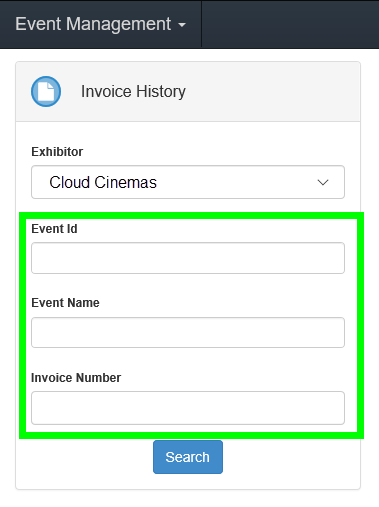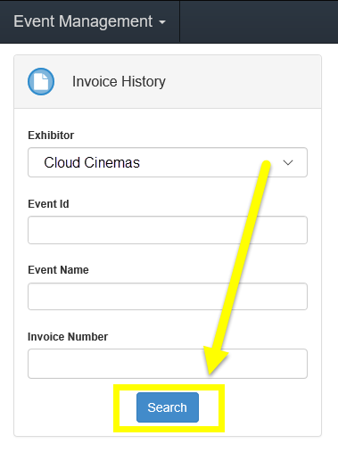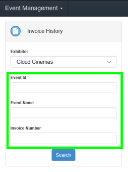 4 - You can further refine your search, for Invoice History, by putting in an Event ID, an Event Name, or Invoice Number in their respective boxes.