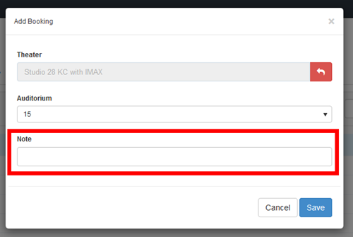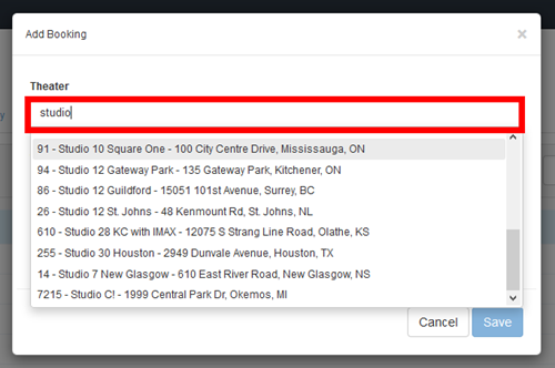 6.3 - This brings up an "Add Booking" box. Type the name of a theater in the "Theater" box. This creates an automatic drop box to choose a theater.