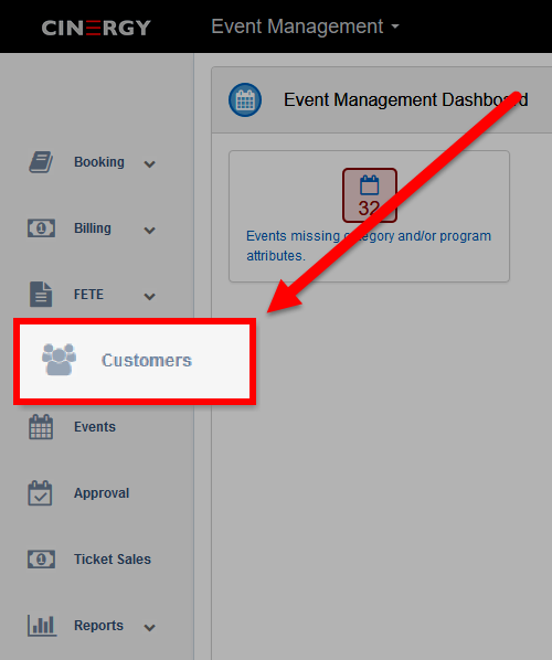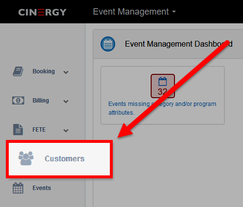 1 - From the Event Management Dashboard, click on the CUSTOMERS link in the left hand Navigation Bar.
