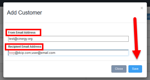 3.1 - This will bring up a screen where you can add "To" and "From" email addresses for that exhibitor. You can can add multiple email address by using a semi-colon to separate them. Then click the blue SAVE button.